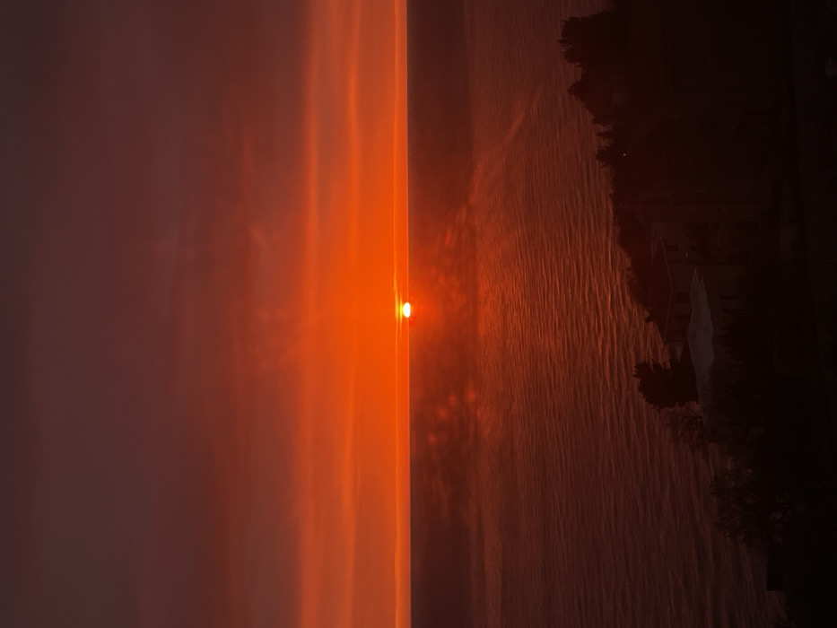 This image presents a sunset scene over a large body of water, consistent with the sea, taken from an elevated perspective in Krstac, Montenegro. The sky is saturated with intense red and orange tones, with horizontal cloud bands prominent, particularly above the horizon, transitioning to darker reddish-purple hues in the uppermost section. The sun, a distinct bright yellow-white disc, is positioned just above the horizon line, casting a direct, luminous reflection across the water. The water's surface exhibits ripples and reflects the red light from the sky and sun, appearing as a dark, reddish-brown expanse. In the lower foreground, a dark, silhouetted landmass, identified as a coastline or hillside, is visible. This landmass features discernible structures with lighter roofs, indicative of buildings, along with dark, undifferentiated foliage. No human figures or specific actions are depicted within the scene.