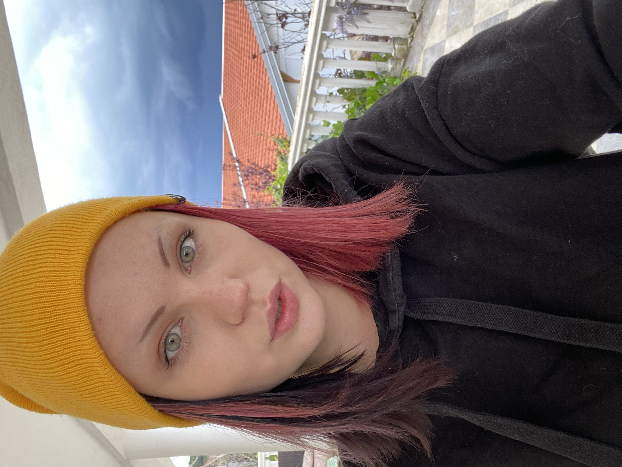 A portrait of a young individual, likely female, taken in Kunje, Montenegro. The subject has fair skin, prominent green eyes, lightly defined eyebrows, and partially open lips. She is wearing a bright yellow knit beanie and a black hooded sweatshirt with visible drawstrings. Her hair is styled with a vibrant pink/red coloration transitioning to a darker, possibly black or dark brown, shade underneath. The scene is an outdoor residential balcony or terrace. Above the subject, a white ceiling or overhang is visible. To the right, a white balustrade with classical-style balusters forms a railing. A patterned, light-colored tiled floor is partially visible in the bottom right. In the mid-ground, a white building with a distinct orange/terracotta tiled roof is visible, surrounded by sparse, reddish-brown vegetation and tree branches. The sky in the background is heavily overcast with dark blue-grey clouds, indicating inclement weather. The subject is positioned facing the camera directly.
