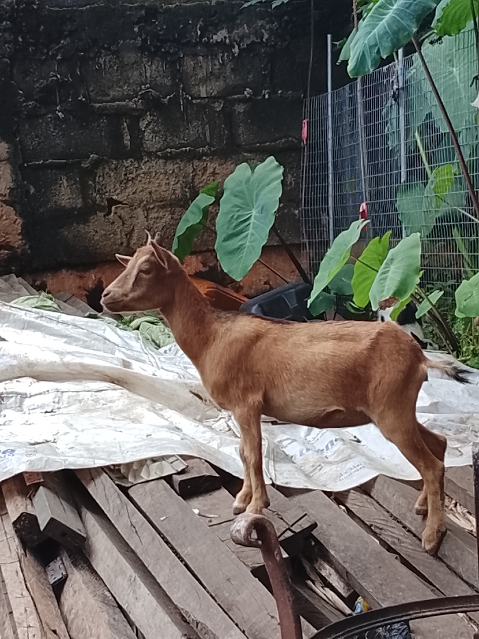 - "A light brown goat stands in profile, facing left, on a platform of stacked wooden planks partially covered by a white tarp" by FM-mJtZ02, licensed under CC BY 4.0