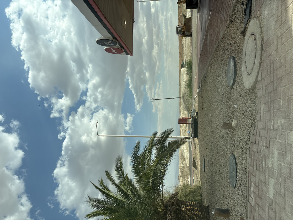 The scene depicts an outdoor roadside or rest area within the Tamar Regional Council, Israel, under a partly cloudy sky. The foreground features reddish-brown brick paving leading to a gravel-covered area. Embedded within the gravel are several circular manhole covers and a short, rusted metal pipe. A large palm tree with green fronds is prominent on the left. In the mid-ground, a tall, white street light pole stands centrally. To the right, a white fuel station canopy with a red trim is partially visible, displaying two circular signs with Hebrew text. Beyond the paved road surface, a red utility box and a white hose are present, with a leaning utility pole further back. The background consists of light-colored, arid terrain with visible piles of earth or sand, and two pieces of heavy construction equipment, including a yellow front-end loader, on the right. No individuals or specific actions are observed.