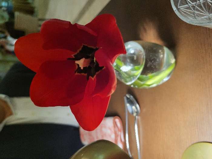 A red tulip flower dominates the scene, its petals open to reveal a dark center. Beside the flower is a small, clear vase with green stems visible inside. A silver spoon rests near the vase. A patterned napkin lies below. The background includes a glimpse of a person wearing white and black clothing, and a table with a wooden surface is visible. A cut-glass dish sits in the upper right corner.