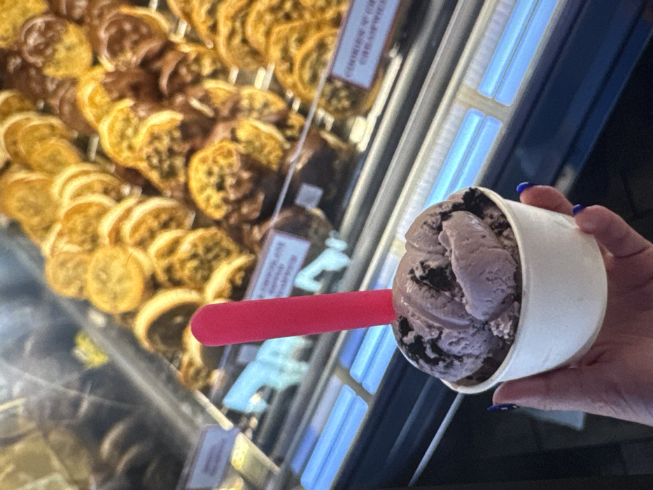 - "A person's right hand, with blue nail polish, holds a small white paper cup filled with purple, cookie-chunked ice cream, featuring a bright pink plastic spade spoon embedded within it" by FM-XmHwp1, licensed under CC BY 4.0