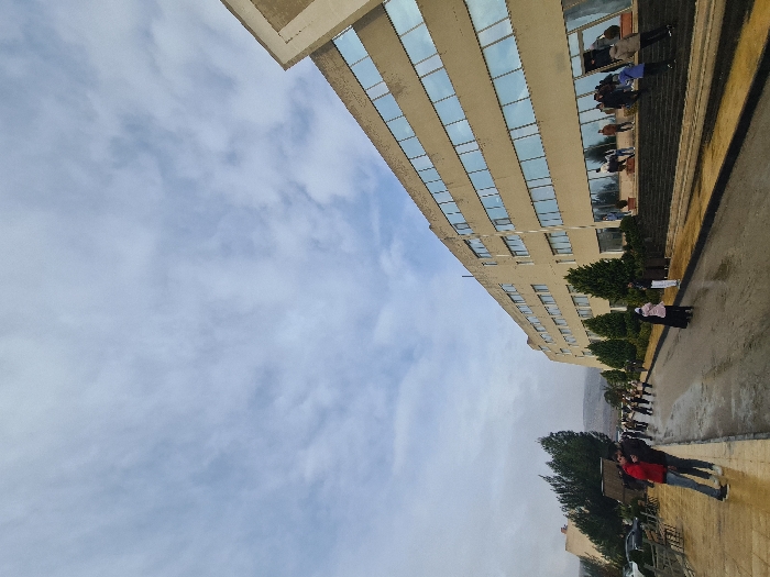 A tall, light-colored building with multiple stories and many windows stands at an angle against a partly cloudy sky. People gather on the steps and on the sidewalk beside the building. Other people are walking on the pavement alongside a row of trees, with vehicles visible in the background.