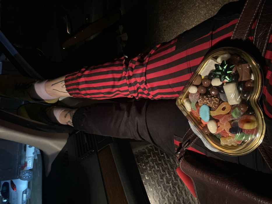 A person sits in a car. They wear black and red striped pants and black sweatpants. Yellow shoes cover their feet, which are encased in white socks. Tattoos are visible above the socks. A heart-shaped box of candy sits on the person's lap. A brown purse hangs off their shoulder. Cars are visible outside the car window.