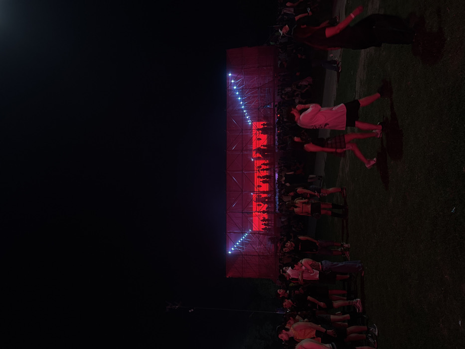A large crowd gathers in the darkness, illuminated by a red-lit stage. The stage is constructed with metal scaffolding and accented with bright white lights. Silhouettes of performers can be seen on stage, and the audience is a mix of standing and moving figures. The setting appears to be an outdoor concert or festival at night.