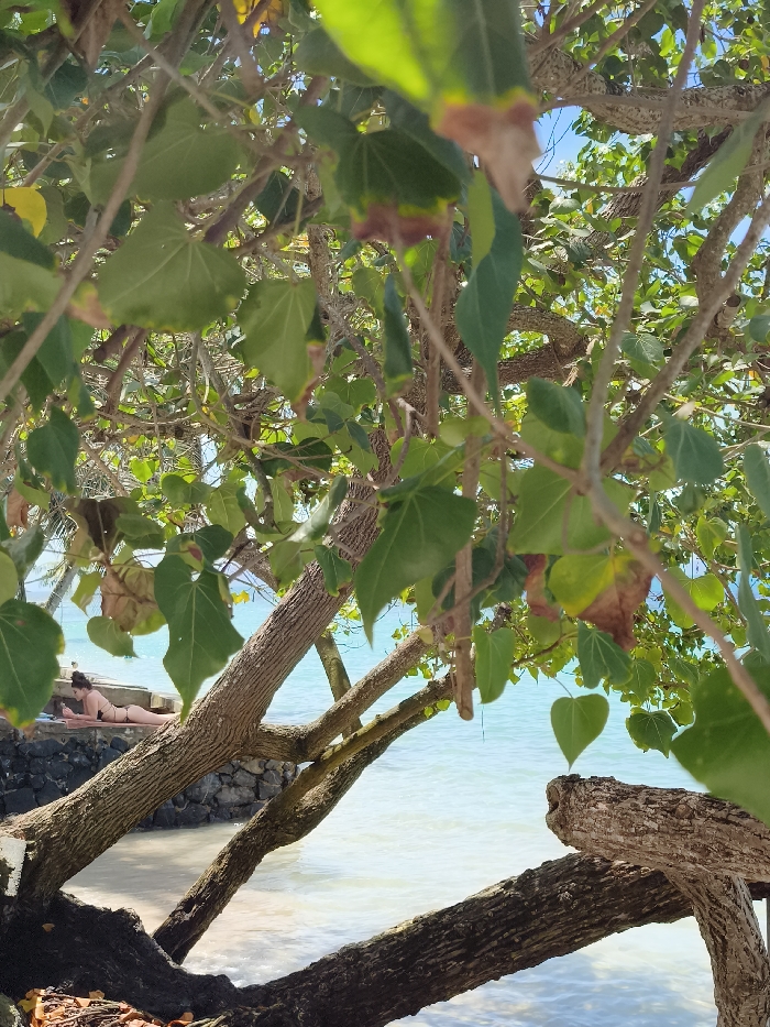 A woman is sunbathing on a ledge near a body of water. She is wearing a dark swimsuit. The scene is partially obscured by tree branches and green leaves in the foreground. The water is light blue and the sky is visible through gaps in the foliage. The ledge is made of dark stones. The branches are brown and textured.