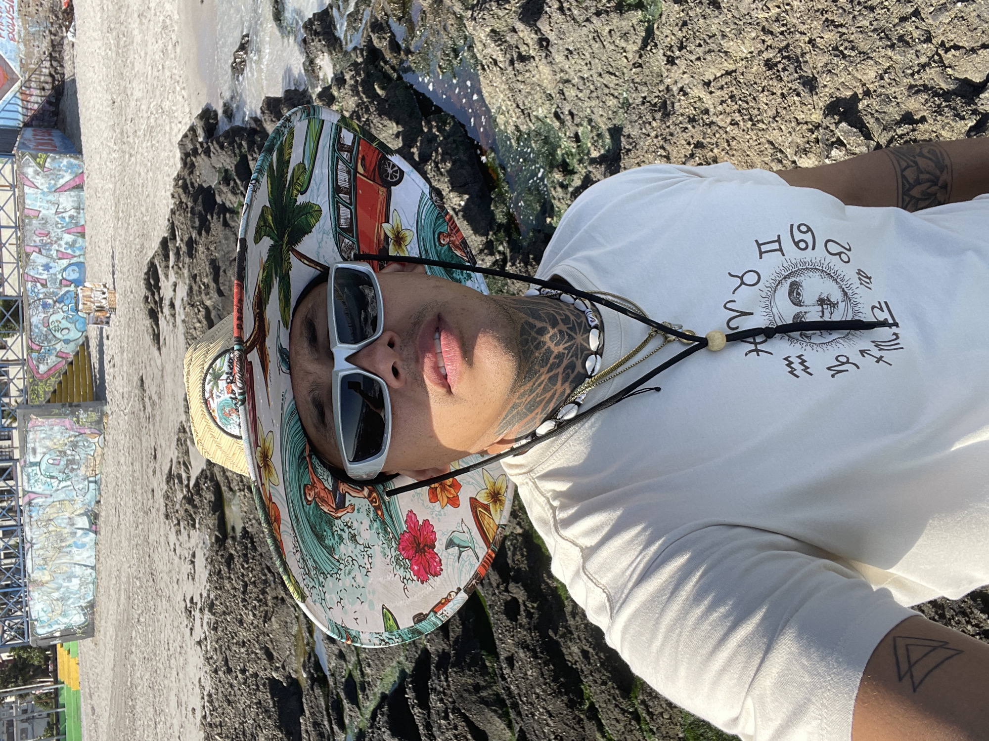 A person with tattoos and a patterned sun hat is photographed outdoors. The person is wearing white sunglasses and a white t-shirt with zodiac symbols. They have several necklaces around their neck. The background includes a rocky area near the ocean. There's a building with colorful graffiti visible in the distance on the left side of the image. The photo was taken in Iquique, Chile, as determined by the distinctive style of graffiti found in that city.