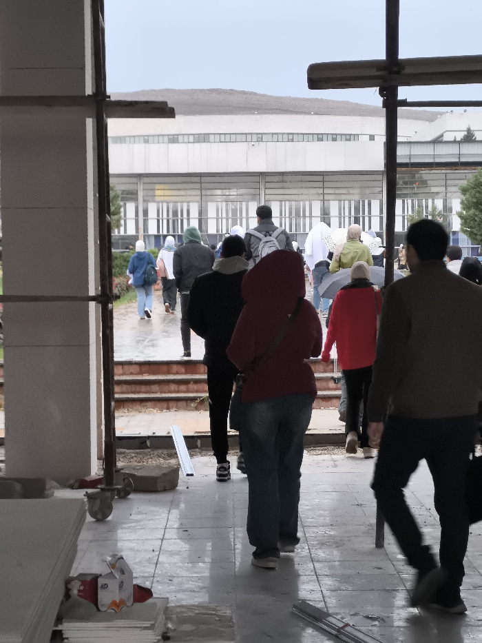 A group of people walk away from the viewer, toward a large building in the distance. The scene is framed by construction elements on the left and right. The sky is overcast. People wear various jackets and head coverings. Some carry umbrellas. A set of steps leads up to the building's entrance. Construction materials lie on the tiled floor in the foreground. Focus is on the people and the background building.