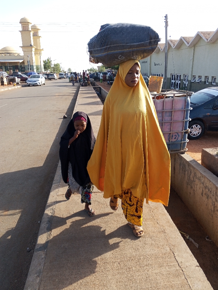 An outdoor daytime scene in Gombe, Nigeria, depicts an urban street with two primary subjects in the foreground