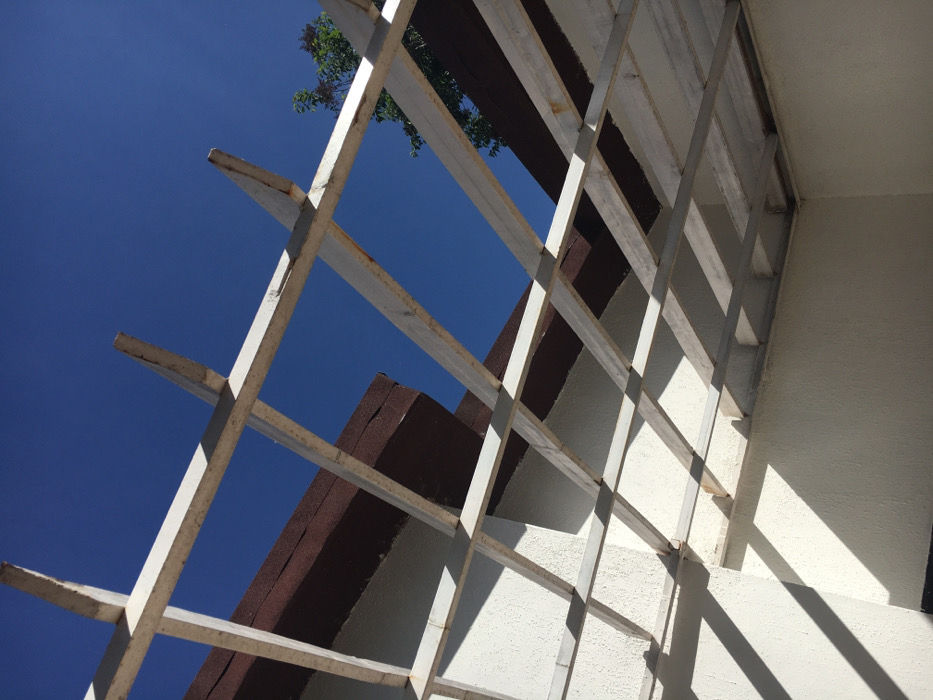 - "The image displays an upward-angled view of a white, grid-patterned metal structure, likely a pergola or roof support, against a clear blue sky" by FM-waaGr2, licensed under CC BY 4.0