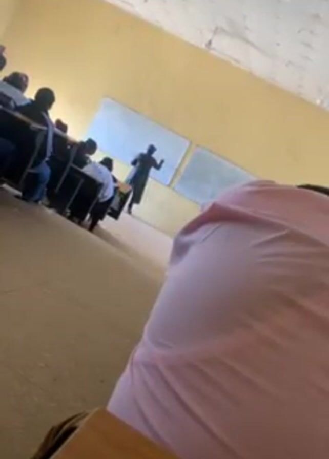 classroom scene. A man in a long coat, wearing a cap, is standing in front of two whiteboards filled with writing. He gestures with his right hand as if lecturing to the class. In the foreground and to the side, the back of a person wearing a pink garment is visible. Several students are seated at desks on the left side of the frame. The classroom has a yellow-painted upper wall and several ceiling fans. The floor appears to be beige or light brown.