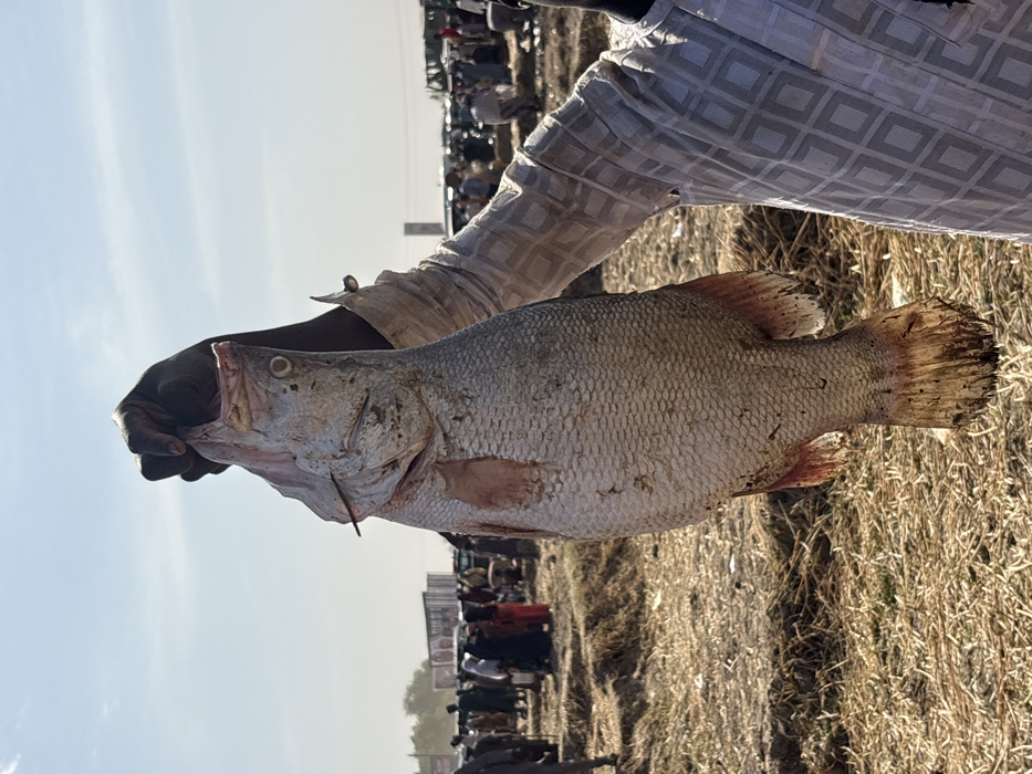 - "An outdoor scene in Kokani North, Nigeria, depicts a dark-skinned individual's hand, wearing a light-colored, patterned long-sleeved garment, holding a large, pale-scaled fish vertically by its head" by FM-2vVbk1, licensed under CC BY 4.0