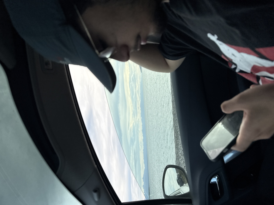The scene, located in Municipio de Tolhuin, Argentina, is captured from inside a vehicle, looking towards the passenger side. A male subject occupies the front passenger seat on the right. He wears a dark baseball cap, gold-rimmed glasses, and a black t-shirt adorned with a white and red graphic. The subject is engaged with a black smartphone held in his left hand, his gaze directed downward at the device. His right arm is positioned behind his head. Through the vehicle's partially open window, a calm body of water extends into the distance, meeting a discernible mountain range under a partly cloudy sky. A narrow gravel shoreline lies between the water and the parked vehicle. The external side mirror reflects a white vehicle and other parked cars on the gravel surface.