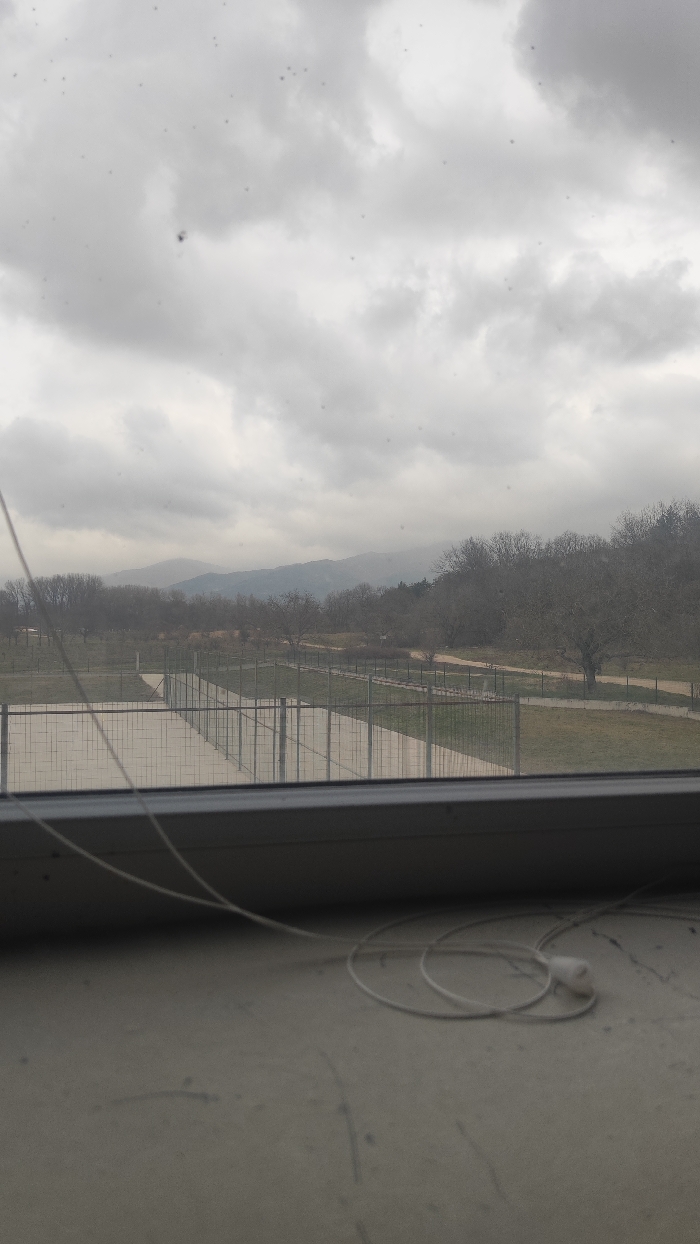 The image depicts an outdoor landscape viewed from an interior window in Kazanlak, Bulgaria, under a uniformly overcast sky. In the immediate foreground, a light gray window sill is visible, on which a tangled white wired earbud is coiled towards the right, with a thin white wire extending from the left side of the sill. Beyond the window, a light-colored metal fence, constructed from a grid of horizontal and vertical bars, encloses a paved recreational area. This area features light-toned concrete or asphalt courts, appearing empty. Further back, a strip of dry, sparse grass leads to a dirt path running horizontally across the midground. Another, less distinct fence line parallels this path, separating it from a dense collection of leafless deciduous trees, indicative of late autumn or winter. In the distant background, a range of low mountains or hills rises, partially obscured by atmospheric haze, beneath the gray, cloudy sky. Numerous small, dark specks are present across the upper portion of the image, consistent with dust or imperfections on the window pane or camera lens. No individuals or active subjects are observed within the scene.
