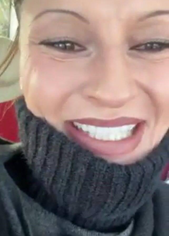 A woman in a dark grey turtleneck sits in the driver's seat of a light-colored car. She is smiling and appears to be looking directly at the camera. She expresses distress over a crack in her windshield. The camera then shifts to the car's dashboard and shows a person pointing to the crack. The car's interior is cream-colored, and through the windshield, one can see a grassy area with buildings in the background.