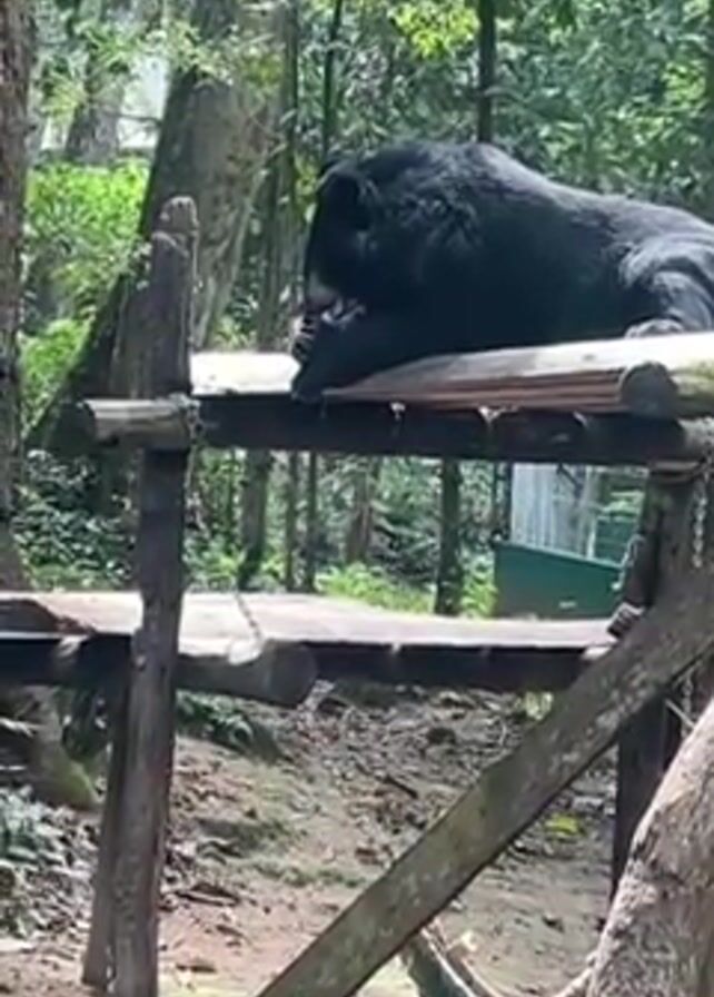 - "A black bear lies prone on a wooden platform in a forest" by FM-NScrU2, licensed under CC BY 4.0