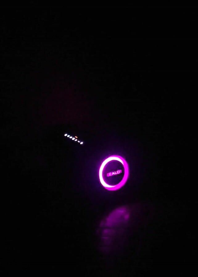A close-up shot in complete darkness reveals a circular object with the word "ZEALOT" in the center. The circle's perimeter emits a bright neon-like glow, alternating between purple, blue, and red. A small series of white lights are visible faintly to the upper left of the circle.