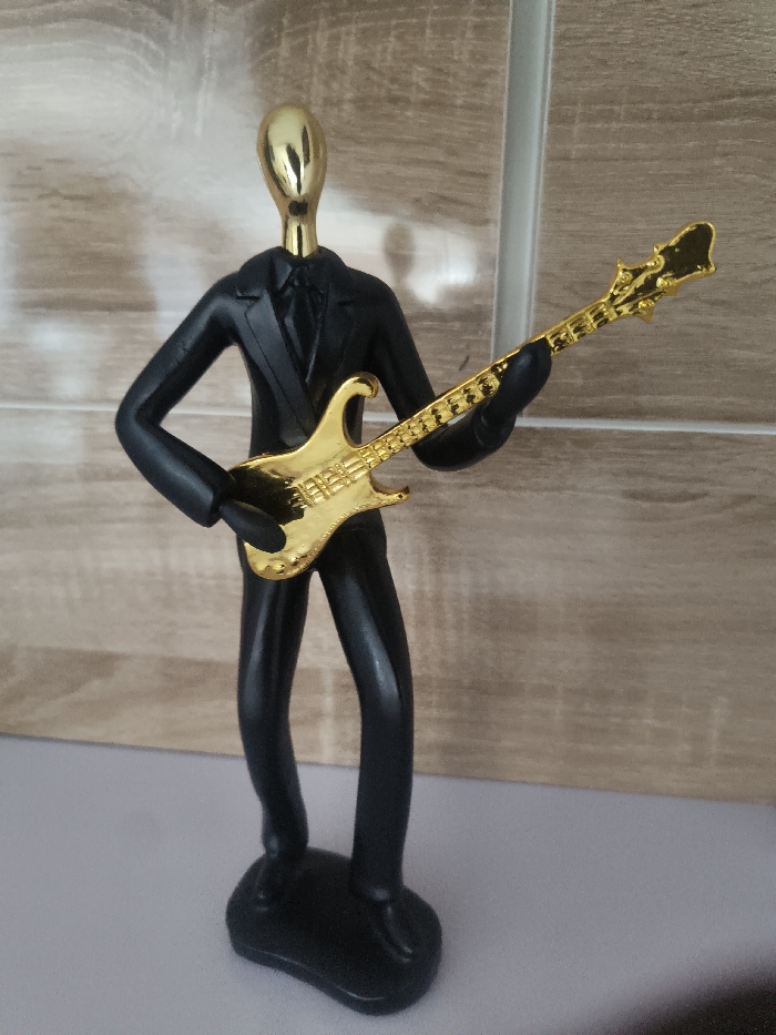 A black and gold figurine stands upright on a light grey surface in Bar Gada, Nigeria. The figurine depicts an abstract, featureless human figure with a smooth, golden, elongated oval head and a slender black body dressed in a black suit with a visible tie. It holds a golden electric guitar across its front, positioned as if being played. The figurine stands on a small, irregular black base. The background consists of a tiled wall featuring rectangular, light brown tiles with a wood-grain texture and a vertical light-colored grout line.