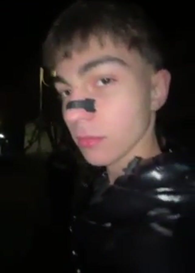 The video depicts two young men outside at night. The first man has short hair and is wearing a black, shiny puffer jacket. He has a piece of black tape on his nose. He looks at the camera with a neutral expression. The second man is wearing a black hooded jacket and is standing near a building. He looks at the camera and smiles slightly. The lighting is dim, and the background is dark, suggesting it is nighttime.