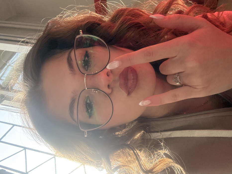 A young female subject is depicted in a close-up, chest-up shot, appearing to be indoors in the city of Pernik, Bulgaria. She has wavy, medium-brown hair, illuminated by bright light from the upper left. Her face is turned slightly to the right, with lips pursed and coated in dark red lipstick. She wears cat-eye style eyeglasses with dark frames and metallic lower rims, and has visible green eyeliner or eyeshadow on her lower lash lines. Her right hand is raised to her chest height, performing a "rock on" hand gesture, with the index and pinky fingers extended and the middle and ring fingers curled, secured by the thumb. Her fingernails are manicured with white tips. A silver-colored ring, resembling a crown, is present on her right ring finger. She is wearing a light-colored, possibly beige or brown, hooded garment. A faint, thin necklace is visible around her neck. The background on the upper left shows a bright, indistinct area with geometric patterns, likely a window or skylight structure. The background on the right is dimly lit with a reddish hue. The subject's gaze is directed towards the camera.