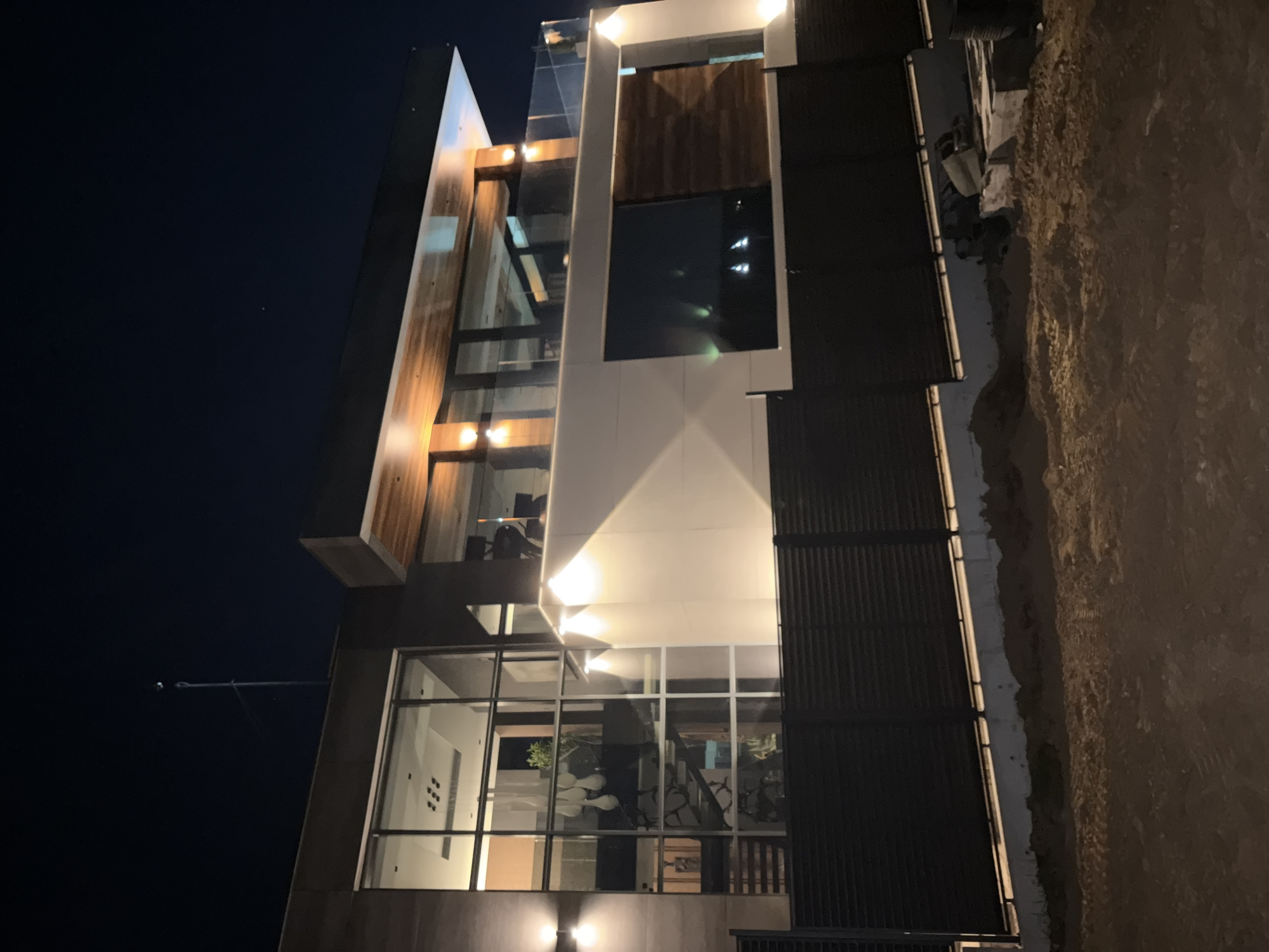 A low-angle shot reveals a modern, multi-story building illuminated at night. The building features large glass windows offering views into the interior, revealing furniture and decor. Vertical wooden slats and metallic paneling adorn the building's exterior. Exterior lights cast a warm glow on the facade. A dark sky is visible above the building, and the ground appears to be an unfinished, possibly construction site. The building's architecture suggests a contemporary design, indicative of modern construction. It is likely located in Bistritsa, Bulgaria.