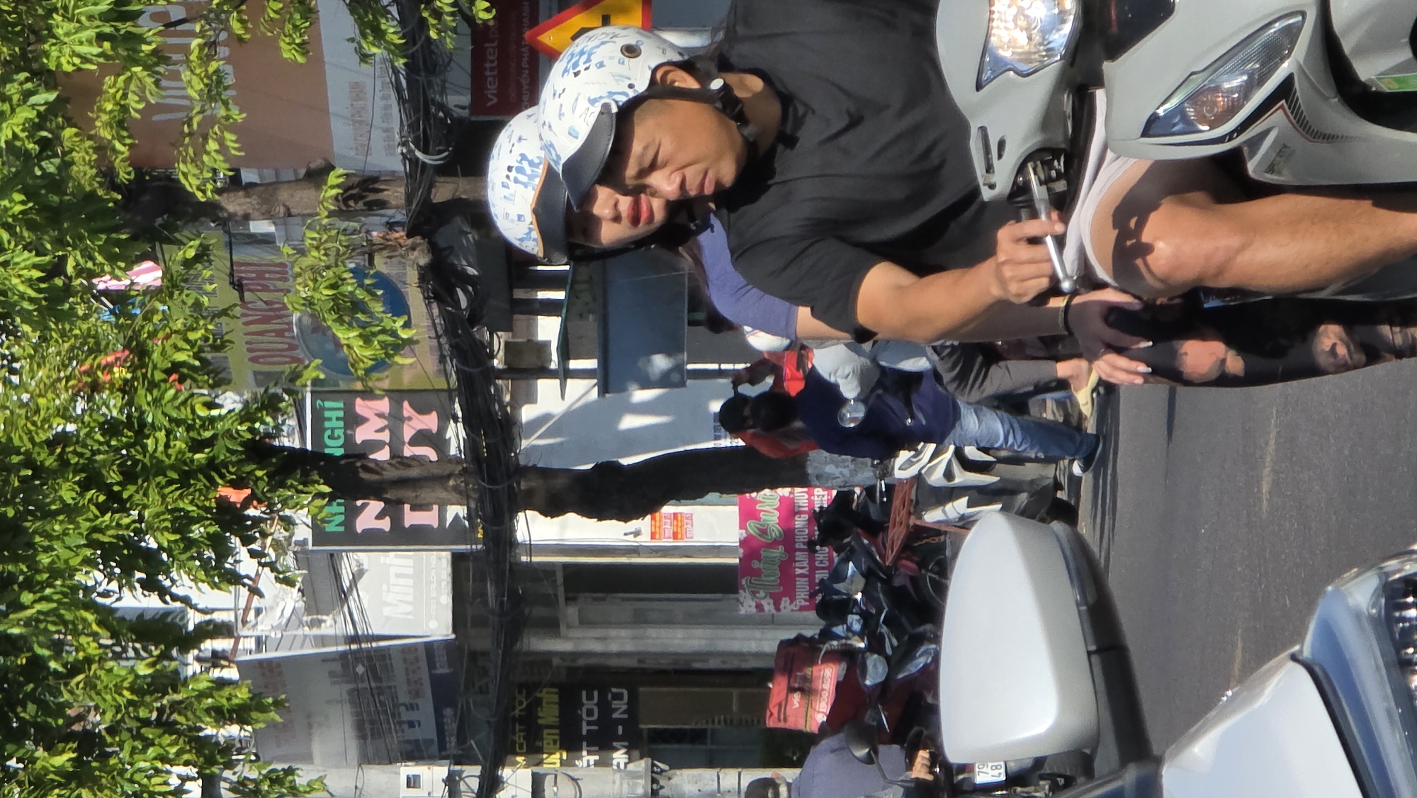 A photograph captured in an urban setting in Vietnam depicts a man operating a light gray scooter, with a woman seated behind him. Both individuals are wearing helmets, with the man clad in a dark shirt. They are positioned on a road lined with parked motorbikes. The backdrop reveals commercial establishments adorned with signs in Vietnamese.