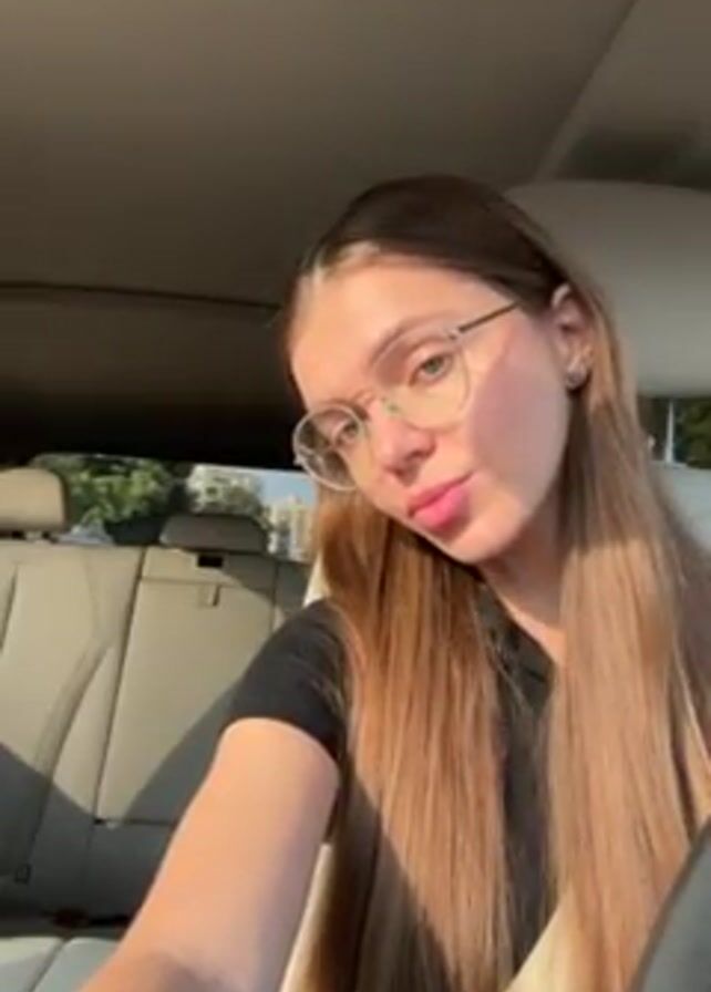 A young woman with long, straight, light brown hair, wearing round glasses and a black t-shirt, is seated in the driver's seat of a car