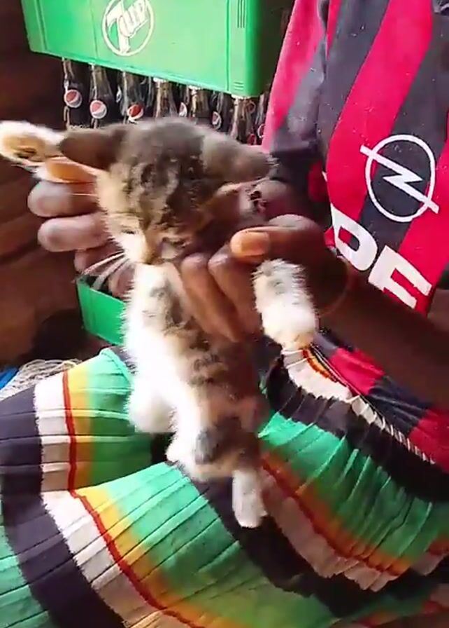 A person wearing a red and black striped shirt with a white logo is holding a small tabby kitten. The person is seated and wearing a colorful striped skirt. Behind the person are several green crates stacked on top of each other. The crates contain bottled drinks such as 7-Up, Pepsi, and Coca-Cola. The kitten is held up by the person, who is making soft sounds.