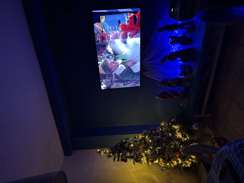 A Christmas-themed room is depicted with a television playing the movie "Elf