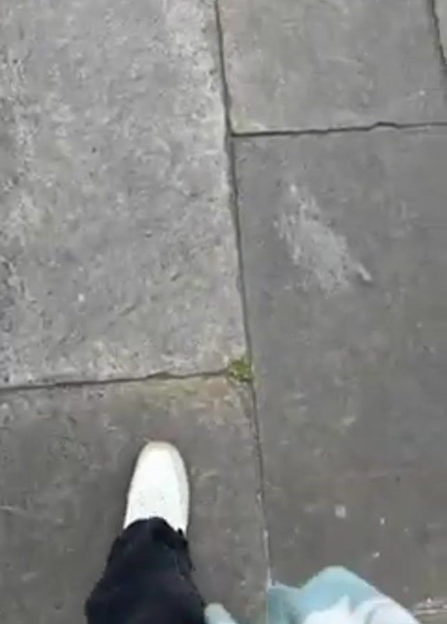 person walking on a sidewalk in a city, stepping from a brick walkway to a sidewalk made of gray stone tiles