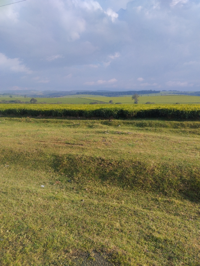 This image depicts an expansive rural landscape in Chepseon ward, Kenya, under a partially cloudy sky. The foreground consists of unmaintained grass and dirt, with an uneven, slightly mounded terrain sloping downwards from the viewer's left to right. Immediately beyond the foreground, a vast tea plantation stretches across the midground, characterized by uniform rows of neatly trimmed, bright green bushes. Scattered mature trees with lighter foliage are visible within and along the distant edges of the tea fields. In the far background, rolling hills or further cultivated lands extend to the horizon, appearing lighter green-blue. The sky occupies approximately the upper third of the frame, filled with numerous white and grey cumulus clouds. No people or specific man-made structures are discernible within the frame.