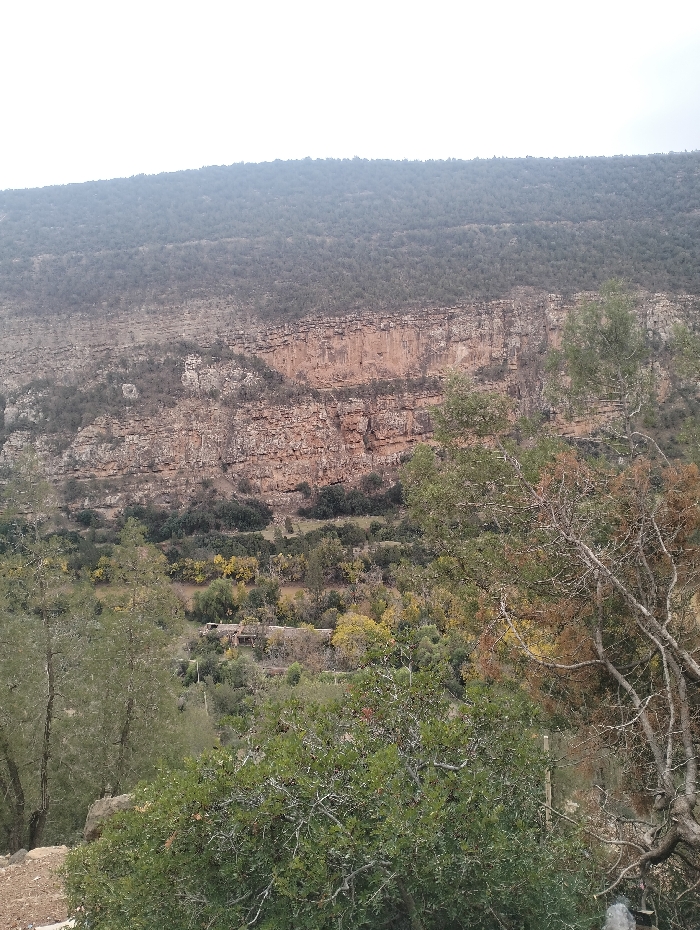 The image displays a panoramic view of a mountainous landscape in Bin El Ouidane, Morocco, under an overcast or hazy sky. The background is dominated by a large mountain range; its upper slopes are covered in dense, dark green scrub vegetation. Below this, a prominent, stratified rock face, primarily reddish-brown and grey in coloration, extends across the mid-background. The midground reveals a valley or lower slope densely covered with various trees and vegetation, including specimens with vibrant yellow foliage interspersed among green and brown trees. Several rustic, low-rise buildings constructed from earth-toned materials are visible within the vegetated valley, notably one multi-level structure centrally located on the left. The immediate foreground features a variety of close-up trees and shrubs: slender trees with sparse green leaves are present on the left, dense green bushy foliage occupies the lower center, and a prominent, gnarled, partially bare tree branch is visible on the far right. No human figures or active subjects are present.