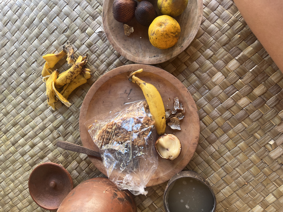 An overhead view of an arrangement of food items and vessels on a light brown woven mat in Batununggal, Indonesia. The mat features a diagonal basketweave pattern. In the upper left, an inverted unglazed reddish-brown clay bowl and a partially visible larger clay pot are present. In the upper center, a pile of yellow banana peels is scattered. Two circular wooden plates are centrally positioned. The left plate contains a clear plastic bag with a granular snack, a ripe yellow banana, a half-section of a light-fleshed fruit revealing a central seed, and scattered brown flakes. A small wooden spoon or spatula rests on the top edge of this plate. The right plate holds three dark-skinned salak fruits, an irregular piece of brown matter, and two yellow-orange citrus fruits with surface blemishes. To the lower left, a dark brown coconut shell cup contains a cloudy, light-colored liquid. A portion of human skin, consistent with a lower limb, is visible in the bottom right corner of the frame. No individuals are fully visible. The environment appears to be an indoor or covered setting.
