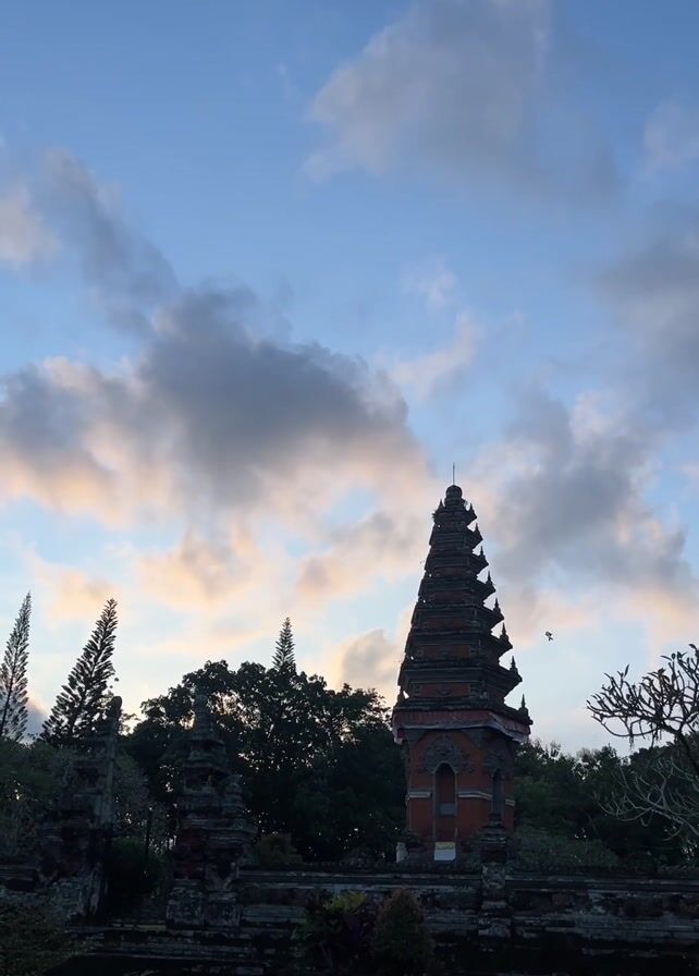 - "tall, tiered, temple-like structure under a sky of blue and white clouds, tinged with the colors of dawn or dusk" by FM-RL7Aj1, licensed under CC BY 4.0