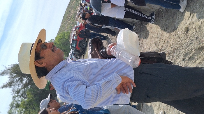 man standing in a dirt lot located at latitude: -16.448, longitude: -71.474 in the city of Sabandía, Peru. He is wearing a white striped long-sleeved shirt and dark pants. He is wearing a large straw hat and sunglasses. He has his right hand on his hip and is holding a clear plastic bottle and a white plastic bag in his left hand. In the background, there are several other people standing around. There is a red jeep parked in the background and some trees in the distance. The ground is dirt and there is a small amount of grass. The sky is partly cloudy. The man is standing at the edge of a small dirt pathway. He appears to be conversing with the person to the left. It is not possible to ascertain what they are discussing. A few of the other people in the background are wearing hats as well. There is a hill in the distance to the right. The trees are fairly sparse. The light is bright and appears to be a sunny day. The man's face is partially obscured by his hat, and he appears to be looking down. The scene is relaxed and appears to be casual.