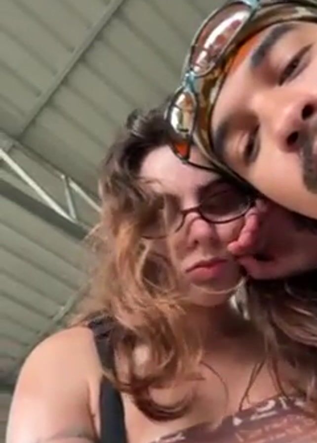 A man and a woman are in a crowded indoor market. The man has dark hair, a mustache, and is wearing a patterned headscarf and goggles. The woman has long wavy hair and glasses. She is wearing a strapless top. The man is holding the camera and taking a selfie video of the two of them as they walk through the market. There are many vendors and shoppers in the background. The woman looks tired.