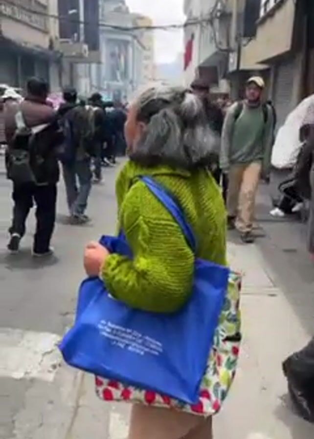street scene, likely a protest or demonstration, in what appears to be an urban environment. A crowd of people, mostly wearing dark clothing, is moving along a narrow street lined with buildings. An older woman in a green sweater and carrying a blue bag looks toward the crowd. A man with a beard and glasses, wearing a grey suit, walks on the sidewalk. The loud sounds of what seem like explosions are audible. A man in a brown jacket is taking pictures with his phone and smiling at the camera. The atmosphere appears tense due to the noise and the ongoing protest.