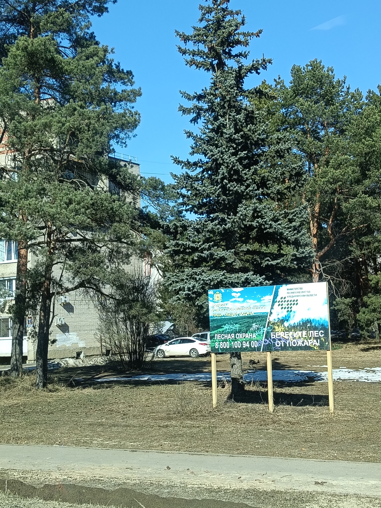 street scene in Vladimir, Russia with a billboard in the foreground. The billboard displays a message about forest protection, bearing the phrase "БЕРЕГИТЕ ЛЕС ОТ ПОЖАРА!", which translates to "Protect the Forest from Fire!", and a phone number for "Лесная охрана" ("Forest Protection"). The billboard is erected on wooden posts and stands on a grassy area mixed with some snow patches. Behind the billboard are trees, including evergreens and deciduous trees with bare branches, partially obscuring a brick building. A white car is parked along the street behind the billboard. The sky is blue and clear. The scene appears to be taken in early spring. The location is indicated as being under the jurisdiction of the "Министерство лесного хозяйства Владимирской области" ("Ministry of Forestry of the Vladimir Region").