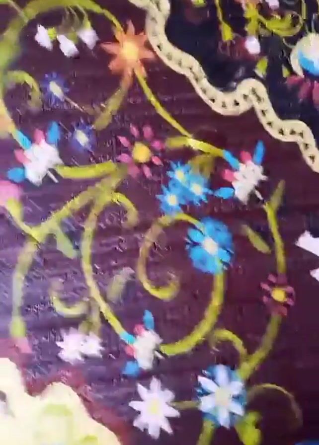 A close-up video shows a textured mat with a dark brown background and a floral design featuring blue, white, pink, orange, and yellow flowers
