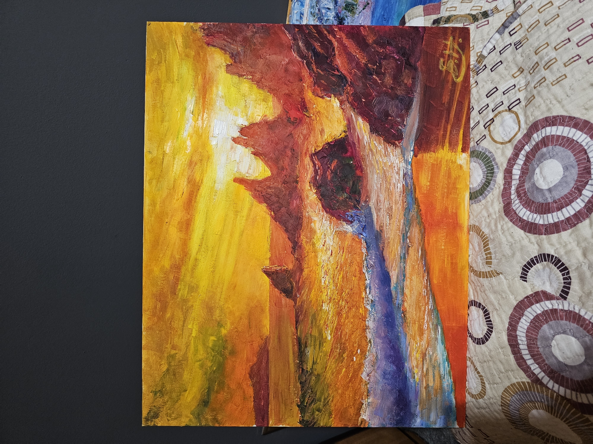 A rectangular, horizontally oriented oil or acrylic painting depicting a vibrant sunset seascape is prominently displayed. The artwork, rendered with a visible impasto technique, features a sky dominated by intense yellow and orange hues, transitioning to lighter tones and hints of green on the left, with a bright white light source near the upper right. Jagged, dark red and brown rock formations rise from the ocean on the right and recede into the distance on the left. The ocean surface reflects the fiery sky with shades of orange, red, and yellow, while a prominent wave in the foreground crests with purple, blue, and white foam as it approaches a sandy or wet shoreline, which also reflects the dominant warm colors. A stylized yellow signature is visible in the bottom right corner of the painting. The painting is propped against a dark, possibly charcoal grey or black, textured wall. It rests on a textured textile surface, likely a bedspread or quilt, which is light-colored and patterned with large concentric circles in shades of brown, red, and grey, interspersed with smaller rectangular motifs. A sliver of another painting, predominantly blue and white, is partially visible on the right side, adjacent to the main artwork. There are no people, specific actions, or interactions depicted in the scene. The image provides no discernible visual information to identify the specific location as Plovdiv, Bulgaria.