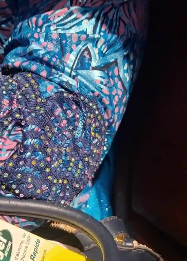 The camera is positioned inside what appears to be a vehicle. A person wearing a colorful patterned garment is seated. A small bottle of “Polygel” is visible inside a dark handbag. The interior of the vehicle has maroon textured fabric. The camera moves slightly, focusing on the fabric and the person. There is conversation in the background but the audio is unintelligible.