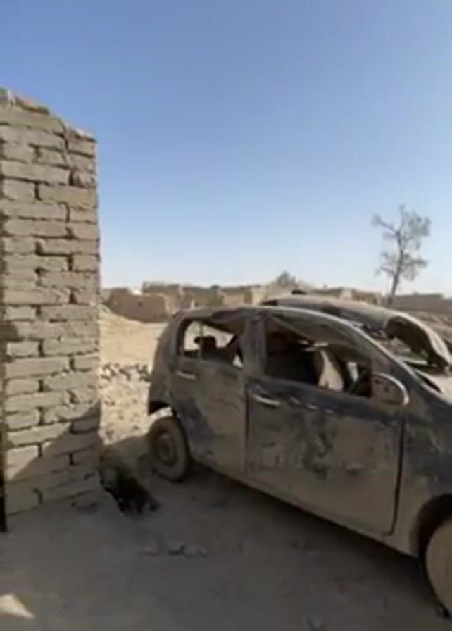 desolate scene in what appears to be a war-torn or severely damaged village under a clear, bright blue sky. In the foreground, there is a badly damaged, muddy car with no roof, parked beside crumbling brick structures and piles of rubble. The car's interior is visible and stripped. Further in the background, there are more damaged buildings, some still standing but clearly in disrepair, with debris scattered around. Two men are visible, wearing traditional clothing, and appear to be examining the damage. Overall, the scene conveys a strong sense of destruction and desolation.