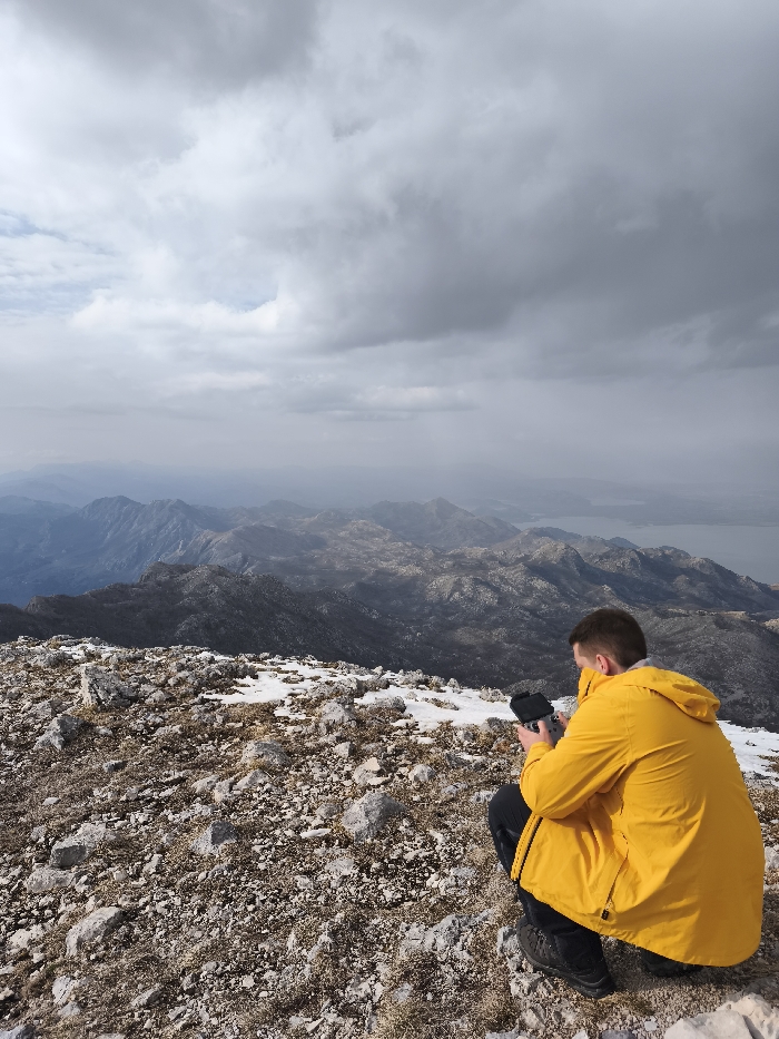 A male individual is observed crouching on a rocky mountain summit in Mali Mikulići, Montenegro, operating a black drone remote controller with both hands