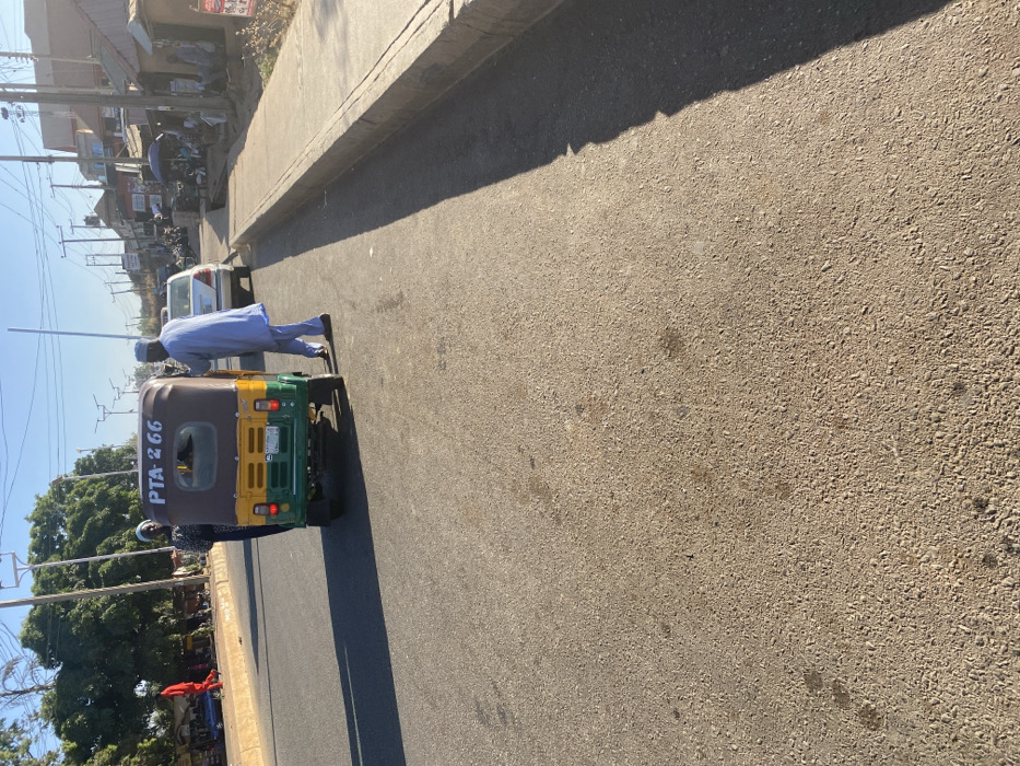 The image displays a daytime street scene in Bukuru, Nigeria. A brown, green, and yellow three-wheeled auto-rickshaw (keke-napep), bearing the alphanumeric identifier "PTA 266" on its rear canvas, is positioned centrally on a grey asphalt road. Two adult males are observed interacting near the rear of the vehicle. One individual, wearing a patterned shirt, stands adjacent to the auto-rickshaw's left rear wheel. The second individual, dressed in a light blue traditional garment, is positioned near the right rear of the vehicle, appearing to engage with it. Further down the road, behind the auto-rickshaw, a white sedan is parked. To the right of the road, a concrete curb delineates a pedestrian area, beyond which a street is lined with commercial buildings, utility poles supporting overhead wires, and visible market stalls with several individuals present. To the left of the road, a treeline with sparse vegetation is visible, along with distant figures and a blue vehicle. The scene is illuminated by strong, clear sunlight, evidenced by distinct shadows cast towards the left side of the frame on the asphalt and along the curb, indicating either morning or late afternoon.