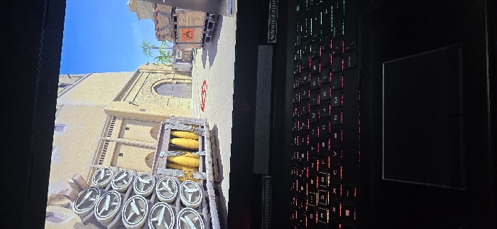The scene is set in Srednogortsi, Bulgaria, depicting a dark-colored laptop displaying a video game on its screen. The upper portion of the image shows the laptop's display, which renders a virtual outdoor environment characterized by tan-colored buildings of Middle Eastern or North African architectural style under a clear blue sky. In the game's foreground, to the left, a stack of light-colored cylindrical objects with circular markings is visible, resting on a wooden structure. Adjacent to this, a wooden crate contains several yellow, elongated objects. On the ground directly in front of the central building, red markings resembling a splatter pattern are present. Distant palm trees and additional structures are visible under the bright sky. The lower portion of the image details the laptop's hardware: a black QWERTY keyboard featuring multi-zone RGB backlighting, with keys illuminated in red on the left side, transitioning to pink/purple in the center, and green on the right. Below the keyboard, a dark, rectangular touchpad is visible. No individuals are present in the physical scene.