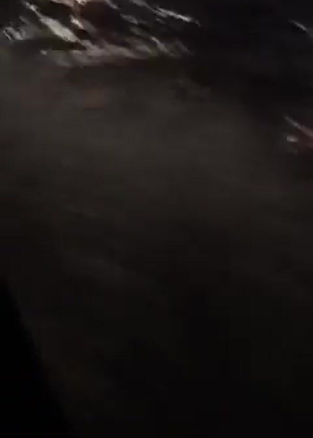 dark, nighttime view of water with lights in the distance. The camera appears to be moving slightly, giving the viewer a sense of being on a boat or at the edge of the water. The lights on the horizon are blurred and scattered, possibly indicating a city or industrial area. The water is choppy and reflects the lights. The overall atmosphere is dark and somewhat indistinct.