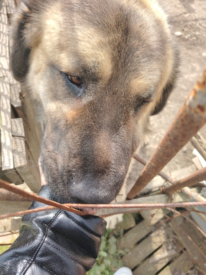 - "close-up, high-angle view of a large dog interacting with a human hand through a barrier in Drianovo, Bulgaria" by FM-X84Fh1, licensed under CC BY 4.0