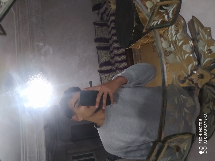 A young person in a gray sweatshirt holds a phone up to a mirror, taking a selfie. The mirror's elaborate frame is visible on the right, with golden floral patterns. A section of decorative wall covering in shades of purple and brown is behind the person. The room is dimly lit, with a bright light reflection appearing on the left side of the mirror. A window is visible in the reflection. The phone's brand watermark is in the bottom right corner.