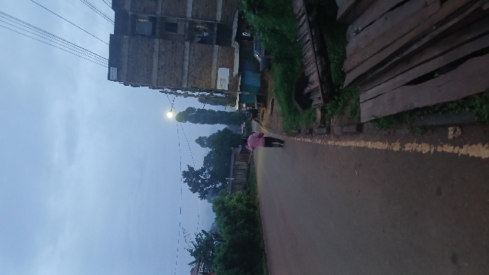 The image depicts a street scene in Kisii, Kenya, captured during a period of low natural light under an overcast sky. A paved roadway, marked on its right edge by a faded yellow continuous line, extends into the background. A single individual, wearing a pink long-sleeved shirt and dark trousers, is observed walking away from the camera along the right side of the road. To the right of the road, a multi-story building constructed of brick or stone, appearing to be four to five floors tall, features multiple windows and balconies, some with visible hanging laundry. Adjacent to the base of this structure are smaller, single-story buildings with light blue/green painted walls and corrugated metal roofs. A dark-colored sedan is partially visible, parked near these smaller structures. Overhead, an active streetlamp illuminates the immediate area, mounted on a utility pole from which multiple wires extend across the street. In the foreground on the right, a collection of rough wooden planks lies on the ground next to a partially obscured ditch or culvert. Dense green vegetation borders the left side of the road and extends across distant, hilly terrain in the background.