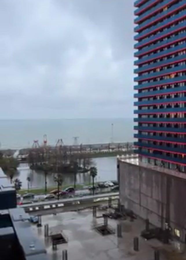 The camera looks out from a high balcony. To the right stands a tall, narrow building, with many windows. Its sides are blue with red highlights. In the foreground is an unfinished concrete building with metal support beams jutting up. Beyond that is a large body of water, with land in the middle and to the left. Cars are parked along the street nearest the camera. In the distance are rides. The sky is gray and cloudy.